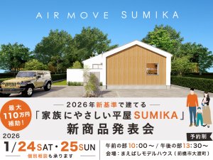 ※「群馬の家を見た」とお伝えください家族に優しい平屋SUMIKA 新商品発表会 開催2026年から始まる新しい住宅の補助金に対応する平屋の住まいの新商品発表会 開催です◎補助金を使って建てたいけど...⇒続きを見る