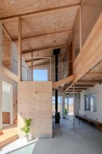 ファミリークローゼット上のステージでは、下階土間との立体的な繋がりの中で家族の気配が感じられるつくりです。2階各個室には、ポリカーボネートの開口を設け、個室として完結しつつも、家族の気配が漏れ伝わる設えとしています。大幅な階段は居場所となり、下のベンチやキッチンからも気配を感じる居場所が連続した住まいです。